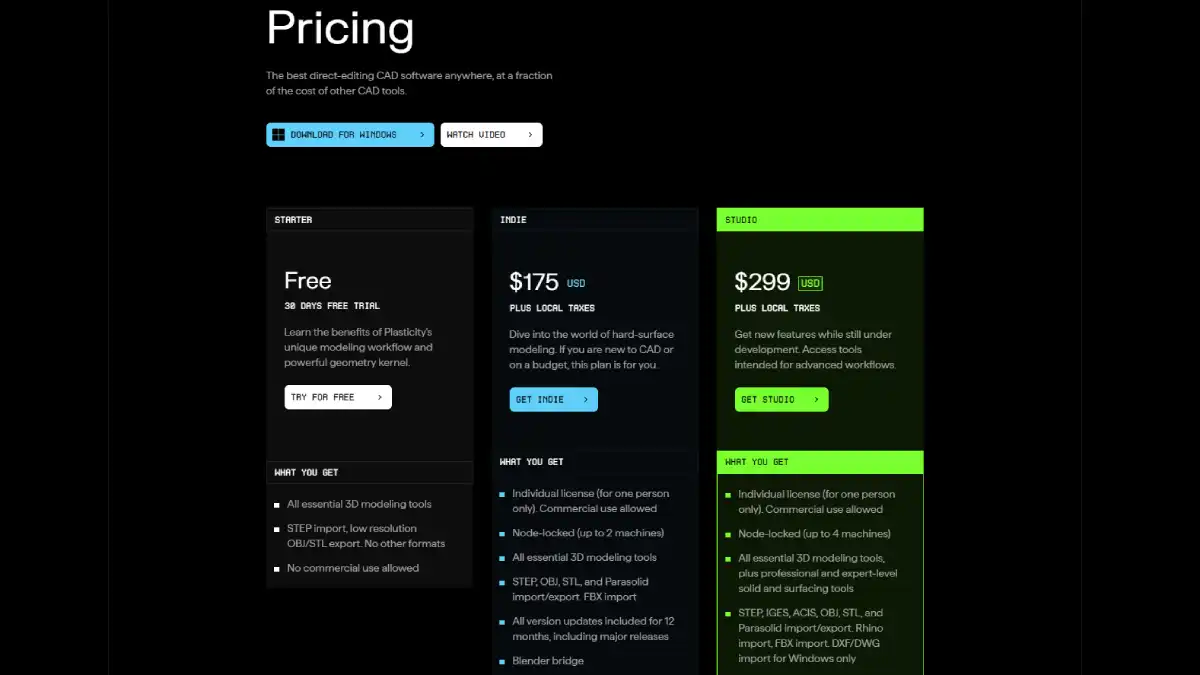 Το Plasticity προσφέρει δοκιμαστική περίοδο ενός μήνα, που είναι υπεραρκετή για να το μάθει κάποιος, ακόμα και αν είναι αρχάριος στο 3D. Η Indie έκδοσή του κοστίζει 175 δολάρια (+φπα), ένα χαμηλό ποσό για κάποιον που σκοπεύει να το χρησιμοποιήσει επαγγελματικά.